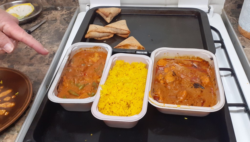 Dinner was my attempt to create the Indian takeaway I’ve been craving for months, by way of Iceland’s range if frozen ready meals; Luxury butter chicken, vegetable tikka masala, pilau rice, and vegetable samosas. (Obviously the menu was chosen with mum’s spice tolerance in mind rather than mine!) It was easy to cook – just bung the lot in the oven and wait for half an hour – and the smells wafting from the oven took me instantly back to the years I spent living above an Indian restaurant, but with better food hygiene3.