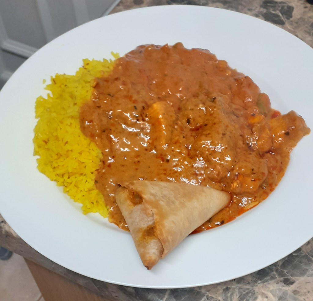 Indian “takeaway” (from the freezer); rhubarb and custard cake with vanilla ice cream