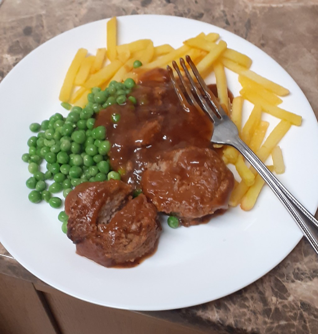Tomorrow is grocery delivery day, which meant tonight’s dinner was a “what have we got in the freezer?” special: mussels in white wine (Iceland) for mum, faggots in gravy (Mr Brain’s) for me, with oven chips and peas with both. I can’t comment on the mussels as I didn’t try them, although I did taste the sauce and it was very salty. That made it a natural counterpart to the faggots, which mostly tasted of black pepper. They had a mushy texture and gelatinous gravy: if I had tried these first I think I would think I dislike faggots, so I count myself as fortunate that I’ve tried and liked the real thing.
