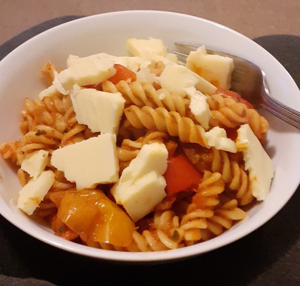 The pasta is super-simple to do: just a tray of Mediterranean veg roasted in the oven, cooked pasta, and a jar of tomato and garlic pasta sauce stirred together. It’s not fancy, but it’s tasty, and there’s enough left for me to have for lunch tomorrow, too.