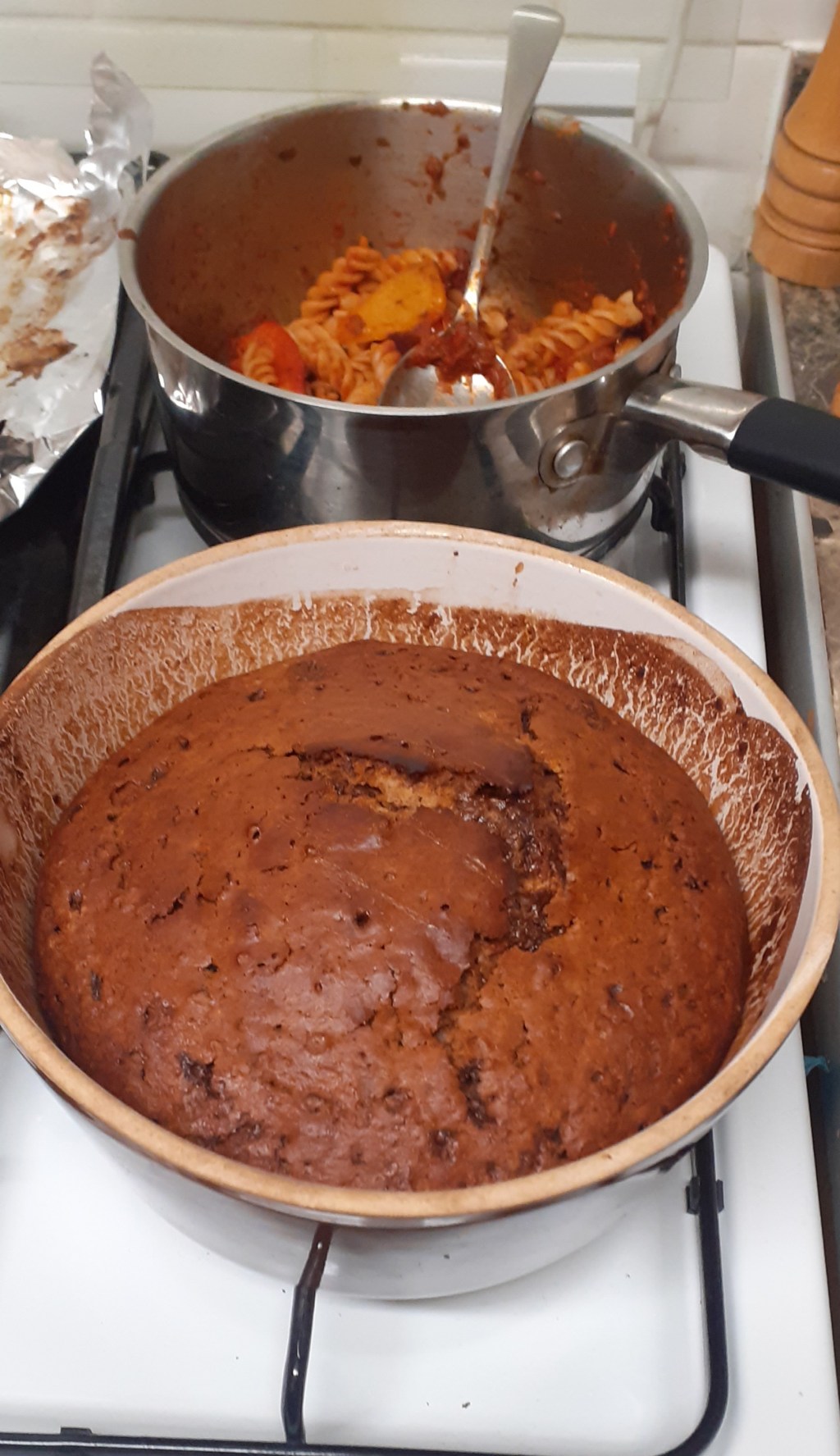 So I decided to make myself feel better by making a cake, but did so a bit lazily by using a bag of cake mix. It’s from the bakery / flour millers Wright’s, and involves simply adding oil and water to the dry mix, stirring it together, and shoving it in the oven. Unfortunately it took longer than expected to cook so, after a while, I had to take it out while the veg for the pasta roasted, then put the cake back in once the veg was done, so we didn’t end up with onion flavoured cake, or ginger cake flavoured veg, neither of which sound particularly tasty.