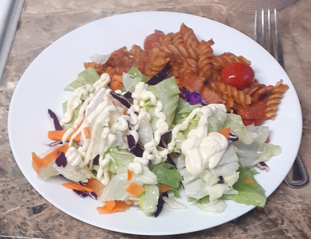 Once the pasta was cooked, it went into the pan of sauce (minus the one that escaped, as one always seems to do), and dinner was served. I would have liked some parmesan to grate over the top, but that will have to go on the next grocery order list.