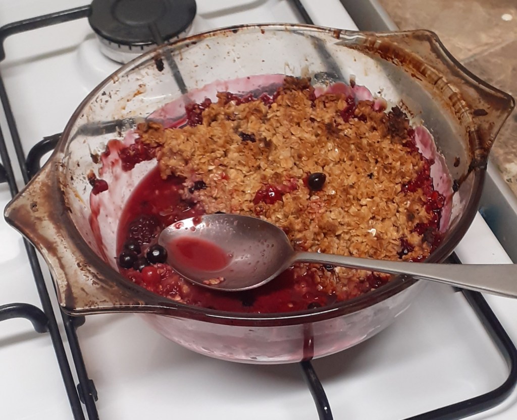 After that I should have taken advantage of all the frozen pre-prepared food we now have, but you know where I go when I have Feelings, and that’s the kitchen3. I started off with a berry flapjack pudding (frozen berries with some sugar to sweeten, topped off with a simple flapjack of melted butter, golden syrup, and porridge oats, then stuck in the oven and baked until golden on top and bubbling around the edges), then put some pasta on to cook while making a simple sauce of chopped smoked bacon, passata, cherry tomatoes, and green pesto.