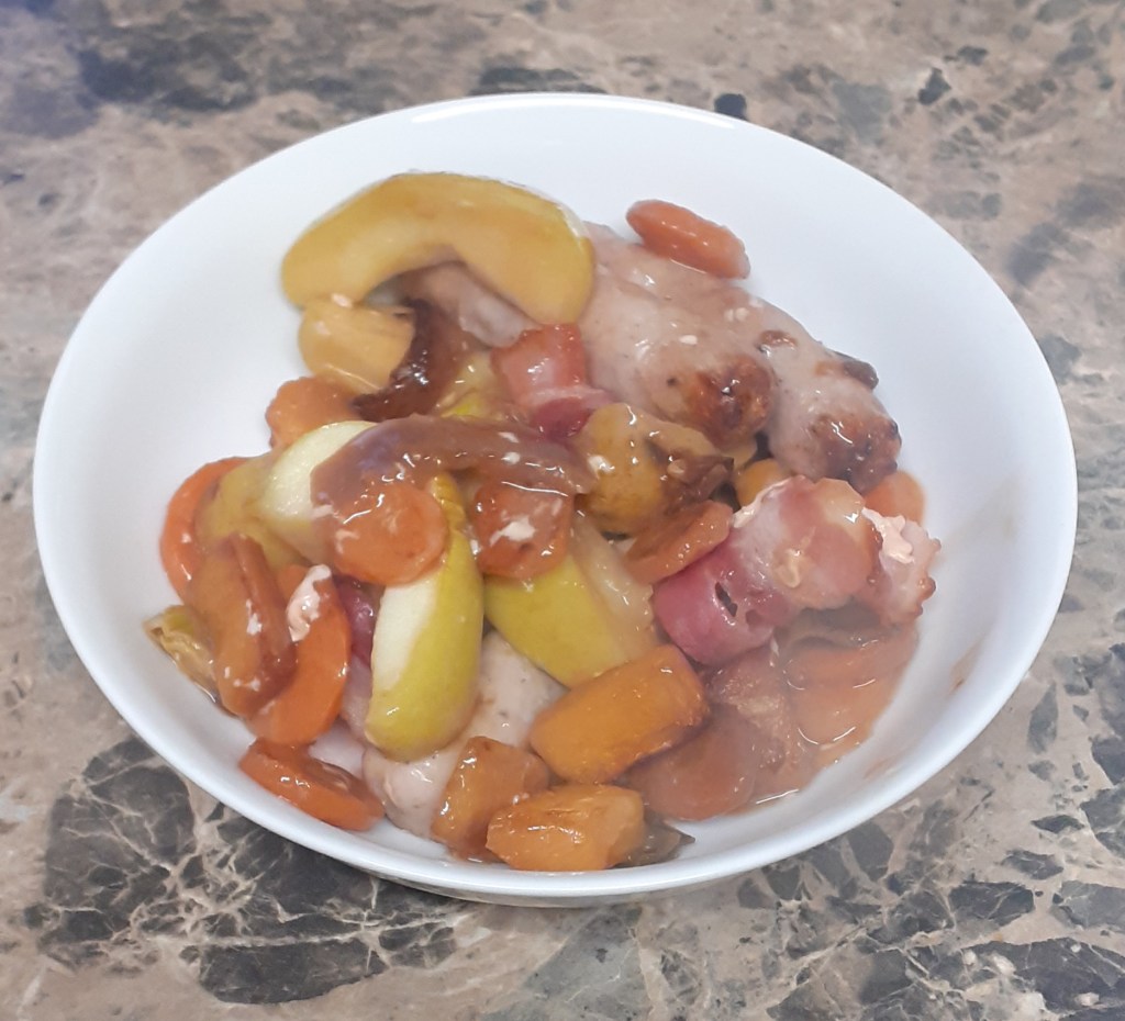 Talking of plates, the other thing I did was, of course, cook dinner. It’s a really easy one, another likely inclusion in my future cookbook: just veg cooked in the oven with a bit of stock, then sausages wrapped in bacon and eighths of apple put on top and cooked until browned. It got two Mum-chelin stars (an unprompted “that was good”), despite mum and I agreeing that the chipolatas were very heavy on the black pepper: they made mum cough quite a lot, which needless to say is not what I intended!