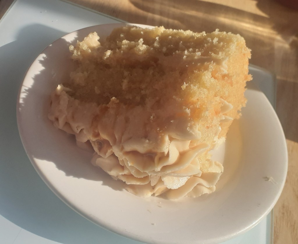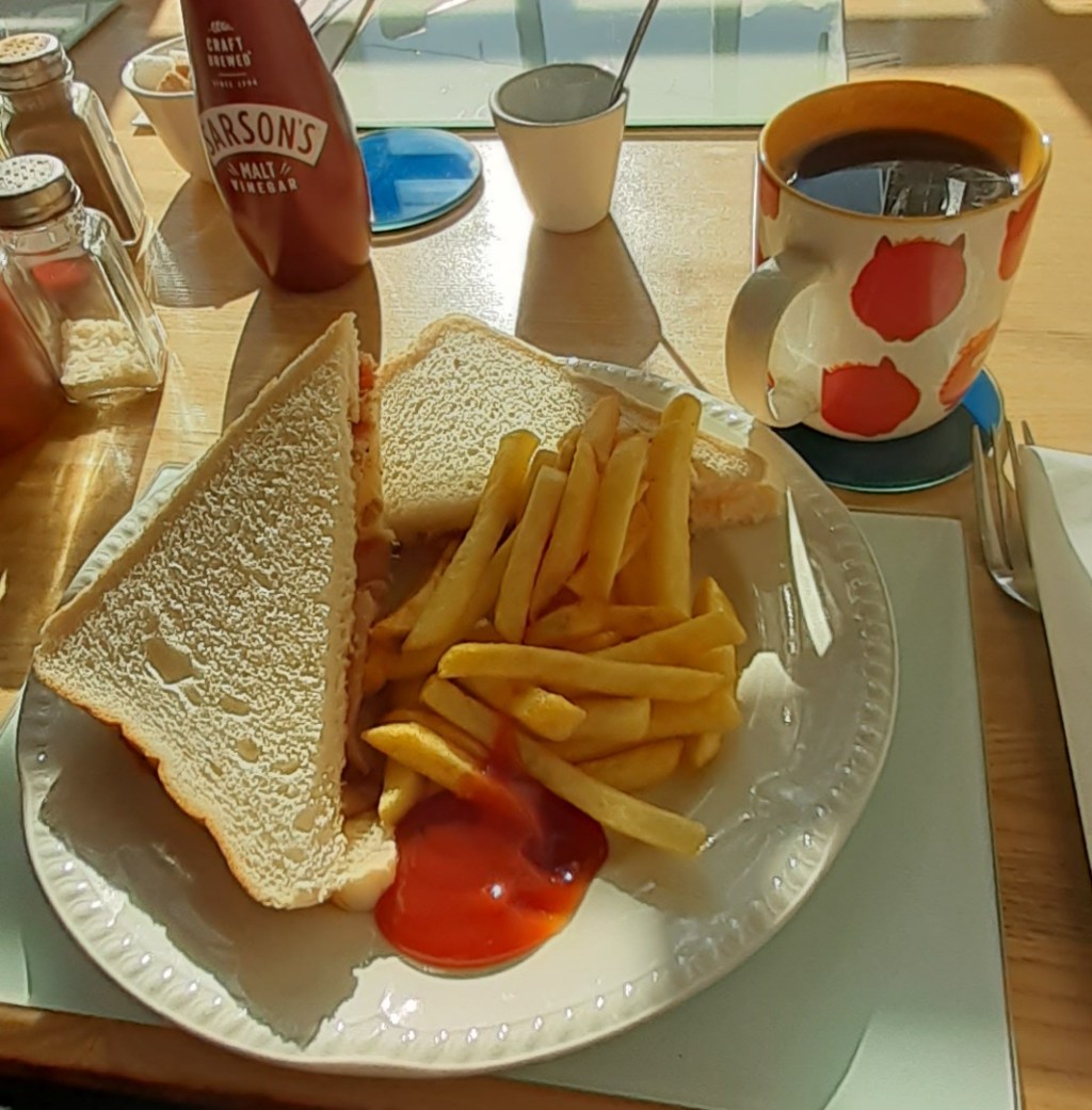 I got a ride down to the village on the little local bus – it took me a couple of attempts to get up the minibus steps but I got there in the end – collected some meds from the chemist, then mooched (or rather click-clacked, thanks to my crutches) across the road to the café Cath and Mike’s. At this time of year nearly everyone visiting is a local, and it has the feel of a village hub, where everyone knows everyone else, and conversations move from table to table as various people join in. It’s all very congenial, and if the bacon sarnie was a bit transport caff (sliced bread, slightly soggy bacon), it was more than made up for by an excellent bit of cake: light and fluffy, with lots of tasty buttercream.