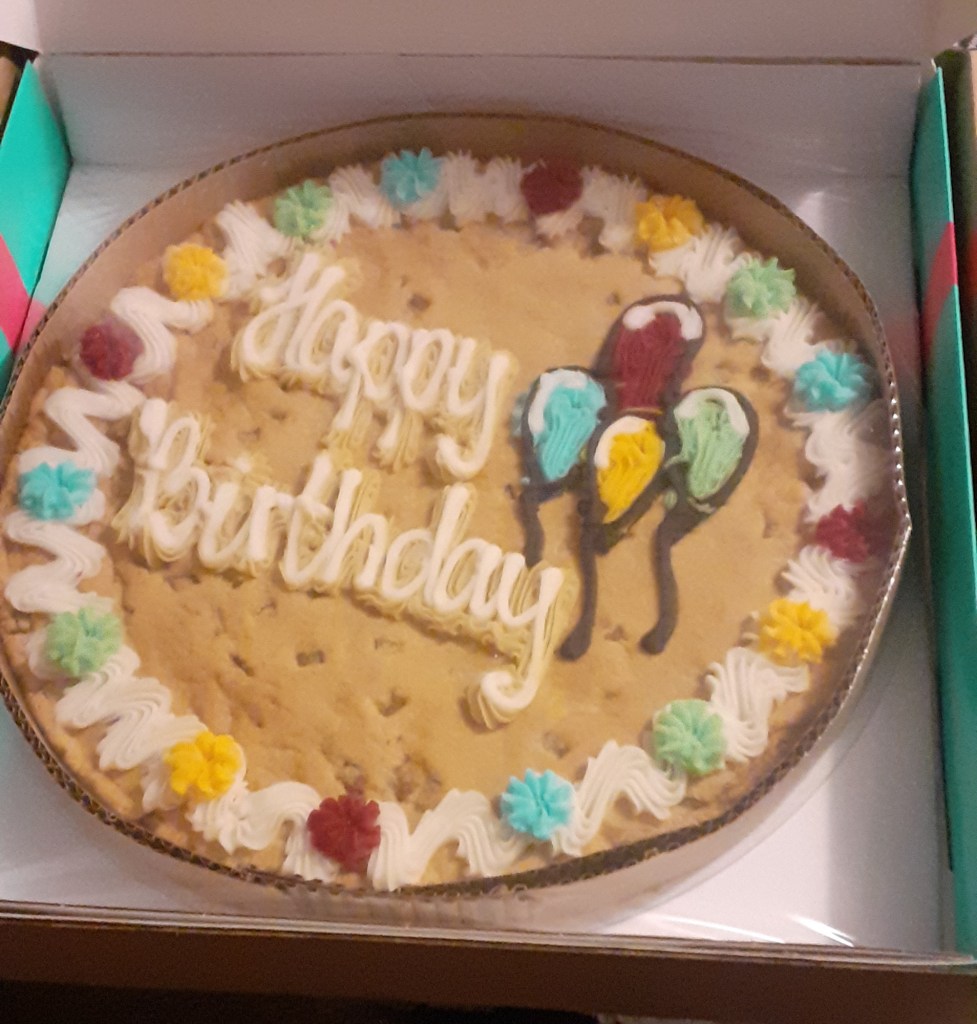 Then I had some of mum’s giant birthday cookie – from Millie’s Cookies, which I remember being delicious but are, at least in this form, mostly just sweet flavour (which isn’t a complaint, mind you) – warmed in the microwave for 15 seconds and topped with vanilla ice cream (the posh stuff from Tesco), and so good I could have eaten it again. Instead I had a cup of coffee, tried to explain to mum how the fake delivery text message scam works (because I received such a text – I wouldn’t even have tried unless I had a good reason), and am now watching the athletics.