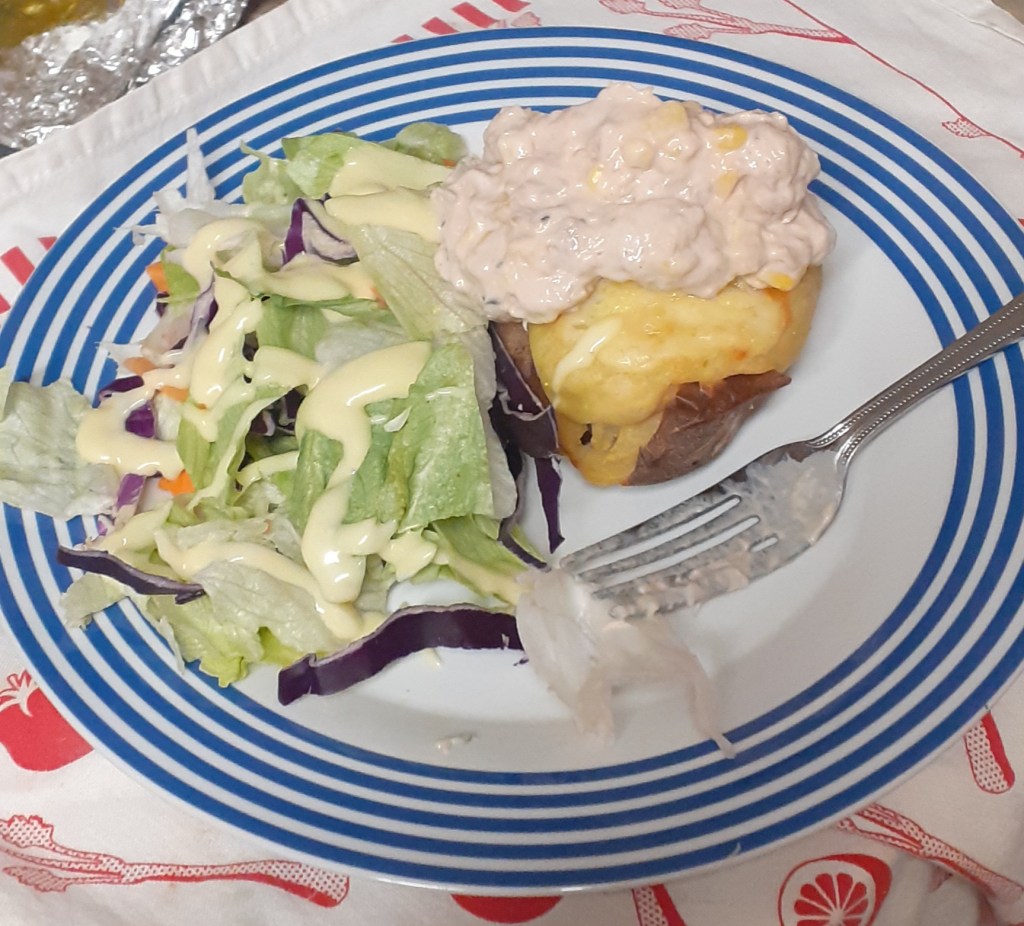 Dinner was, once again, a combination of pre-prepared items: cheese jacket potatoes from Tesco, with additional cheese to supplement the pathetic sprinkling on top – other than this, I found them better than expected, with a decent baked potato flavour and a nice fluffy texture2. I added tuna and sweetcorn mayo sandwich filling to mine, as that’s how I think a jacket potato should be topped, added some salad and salad cream, and pretty much inhaled the result as all that activity left me ravenous.