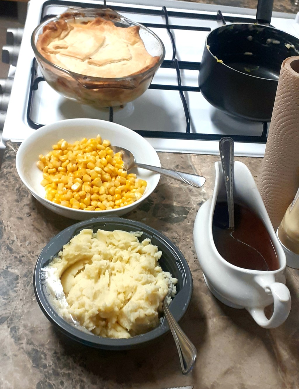 Anyway, we had the pie with mash (Tesco Finest, from the chilled section, which I can strongly recommend – it’s properly buttery and creamy, just what you want from a bit of mash), sweetcorn, and some gravy (from granules, but no worse for it): mum cleared her plate and finished with an unprompted “that was nice”, so that’s two Mum-chelin stars.