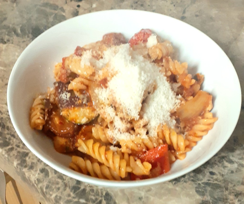 Tonight’s dinner was therefore very simple, as well as a good use for various bits and bobs: half an onion, half a red pepper, a mini pot of ready-chopped chorizo, and the last of the meat off the roast chicken, all of which were just sitting in the fridge. Combined with a jar of tomato and chilli sauce, some cooked pasta, and some ready-grated Grana Padano, it was a very tasty meal.