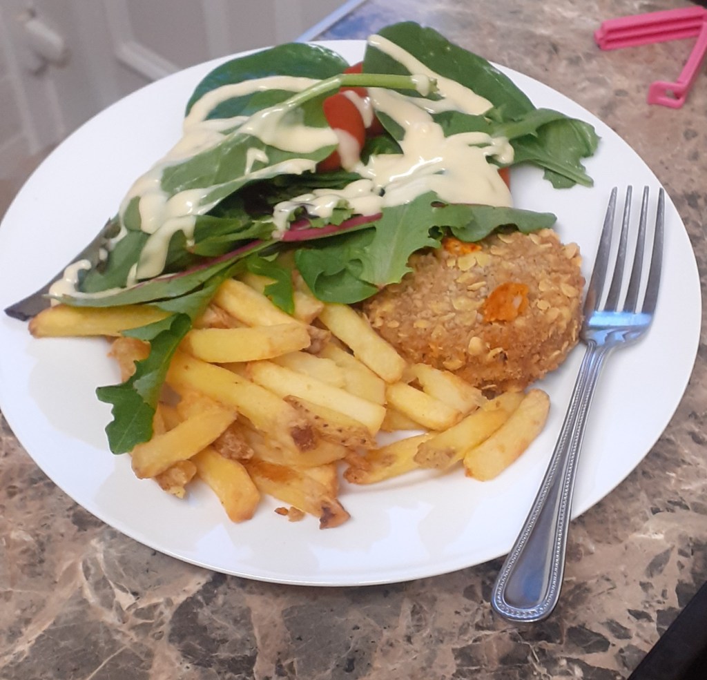 Nacho bean burgers, chips and salad; toffee apple pudding and ice cream
