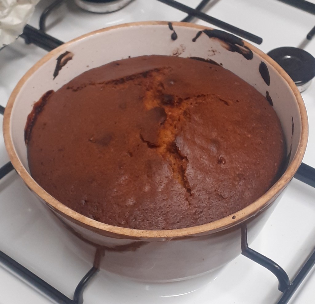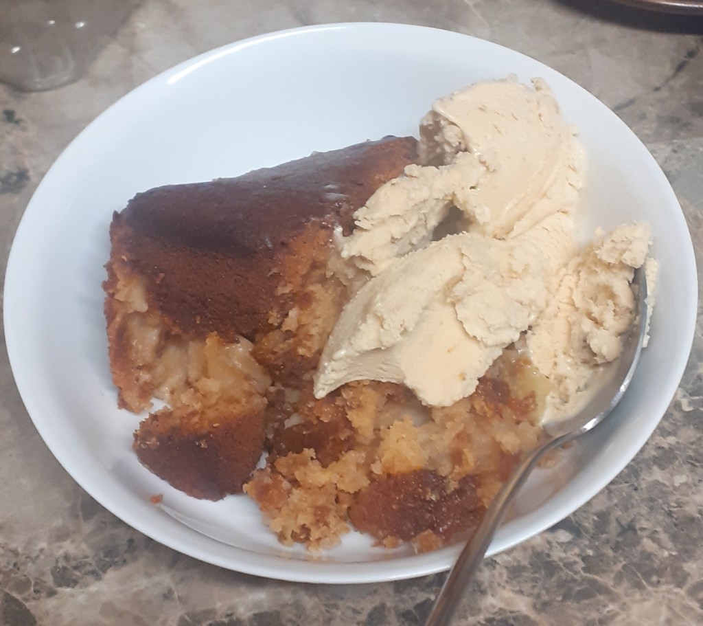 So I did what I so often do when I’m stressed or sad, or both, and did some cooking. The cake itself came from a packet – toffee cake, with real bits of toffee – to which I added a bottom layer of chopped bramley apples and brown sugar.