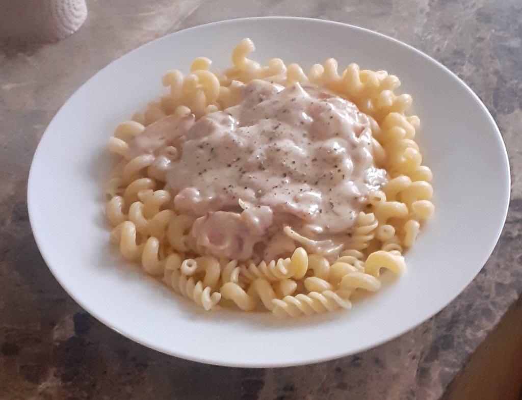 The recipe, such as it is, is simple: roughly chop your bacon and whatever veg you’re using (I pretty much always use onion, because I like it, and would usually include mushrooms but left them out because mum doesn’t like them (and because we didn’t have any)), and fry with a splash of oil until starting to brown. Add a couple of tbsps of flour, stir together, and cook for a couple of minutes, then add milk, seasoning, herbs, and any quicker-cooking veg (peas, green beans, sweetcorn kernels, and the like), and simmer over a low heat until the sauce thickens.