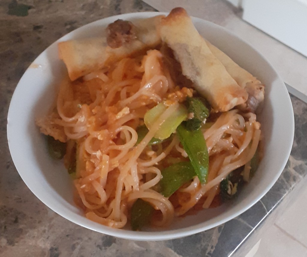 Dinner was a kit meal – noodles, sauce, crushed peanuts – from Blue Dragon, to which I added a pack of stirfry veg and an egg from the fridge. It was spicy, but not too spicy, and got two Mum-chelin stars (an unprompted “that was nice”).