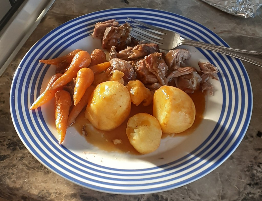 Dinner was slow-cooked lamb – ready prepared from Tesco and just needing heating through – roast potatoes, and mini carrots which refused to cook through and had to be finished in the microwave. Mum enjoyed it and cleared her plate. I enjoyed mine even when the contents of my plate tried to clear me: I stuck my fork in one of the roast potatoes and it ‘sploded, showering my face and t-shirt with bits of hot potato. I of course got my revenge the natural way, by eating the offending potato.