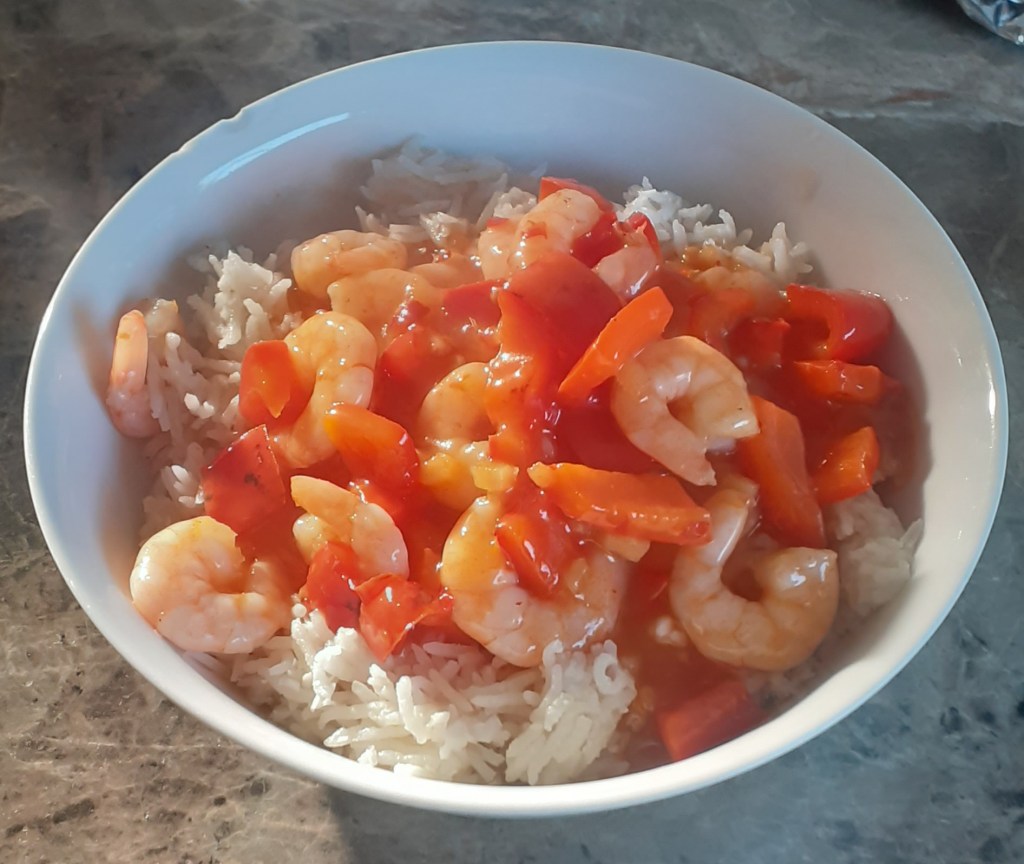 Today was grocery delivery day so I had plenty of fresh produce to make an easy meal. I opted for something dad used to cook – not that mum could remember that – with added red pepper for purposes of health. (Dad used to make it with just prawns, which was nice, but I prefer a bit of veg in my meals.) It’s dead simple to make, particularly if you use microwave rice (Tilda brand – nicely light and well-separated grains with a good coconutty smell but no real taste of coconut – I wish I’d cooked my own after all) and mum declared it “just the right amount of spicy” and seemed to really enjoy it.