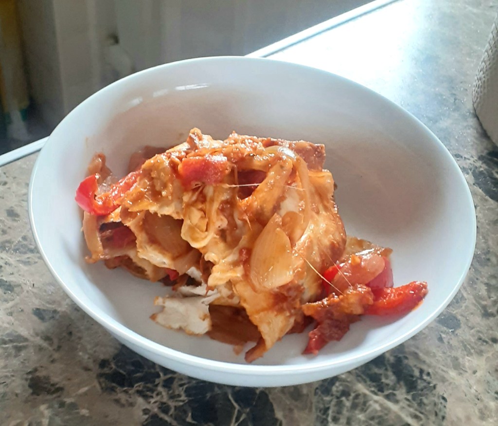 No problem, we have mini tortillas in the cupboard, I’ll do mini enchiladas. But the mini ’tillas were all stuck together in a lump, and came off in shreds, so I decided to do it in layers in a dish, turning the enchiladas into an enchilasagne (patent pending).