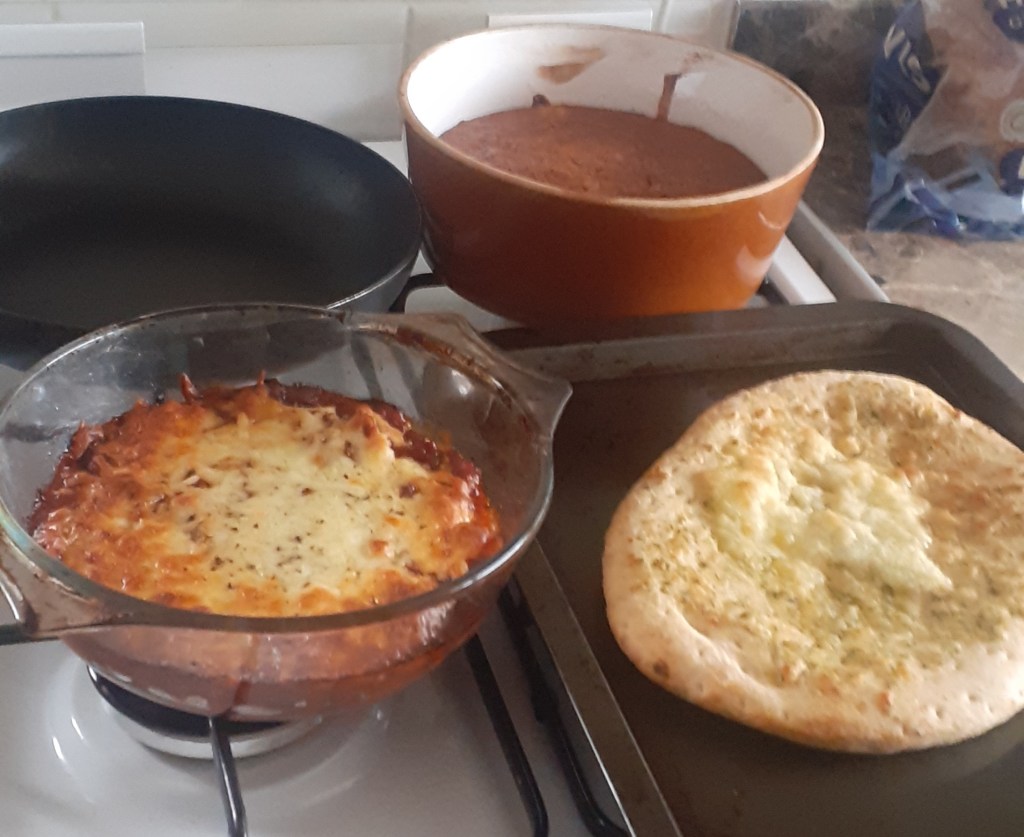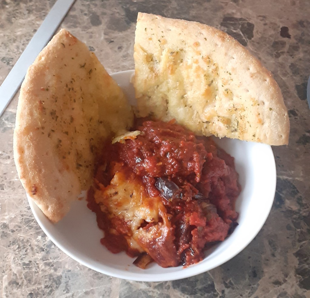Aubergine parmigiana with cheesy garlic flatbread; pineapple sponge and ice cream
