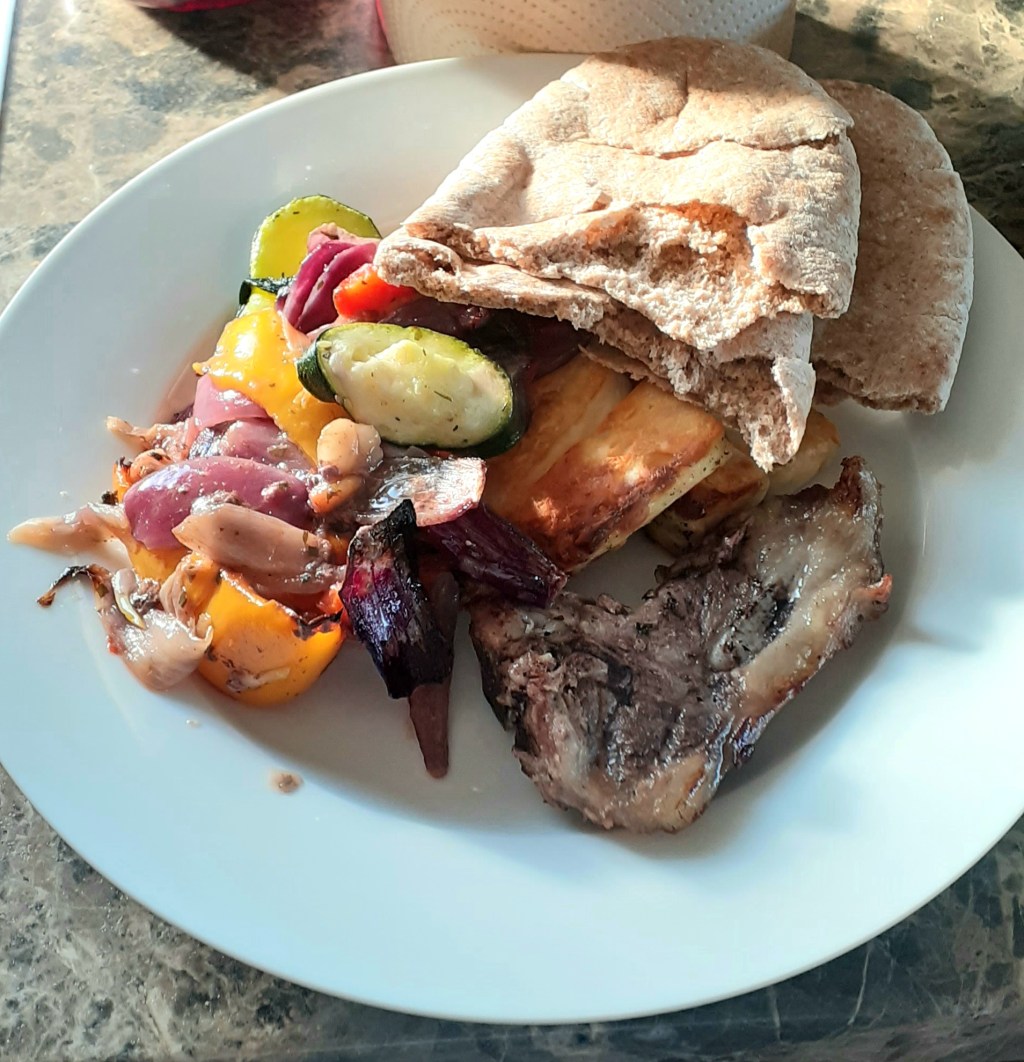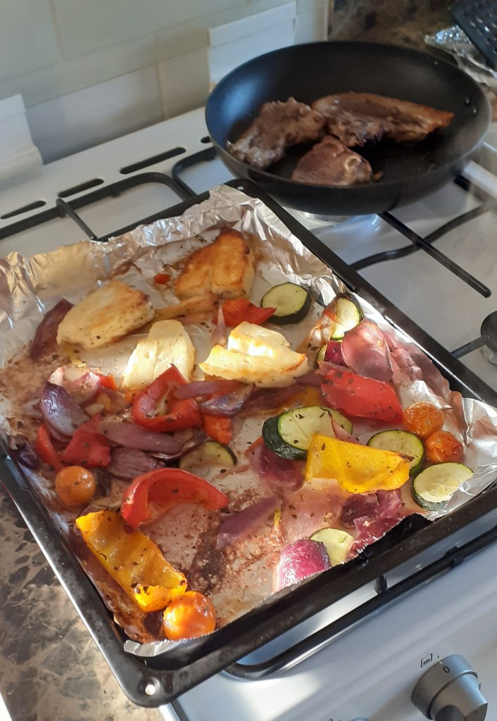 Dinner tonight was another traybake, this one of Mediterranean veg, halloumi (for me) and lamb chops (for mum, as she’s not keen on “squeaky cheese”, as my sister called it). I finished off the chops in a hot frying pan to give them the colour the recommended oven bake denies them, and they smelled good enough to eat: the little one I had tasted almost as good as it smelled, although there was barely a mouthful of meat to actually enjoy.