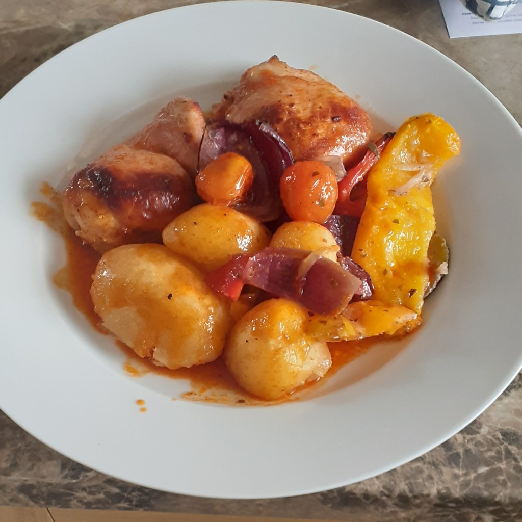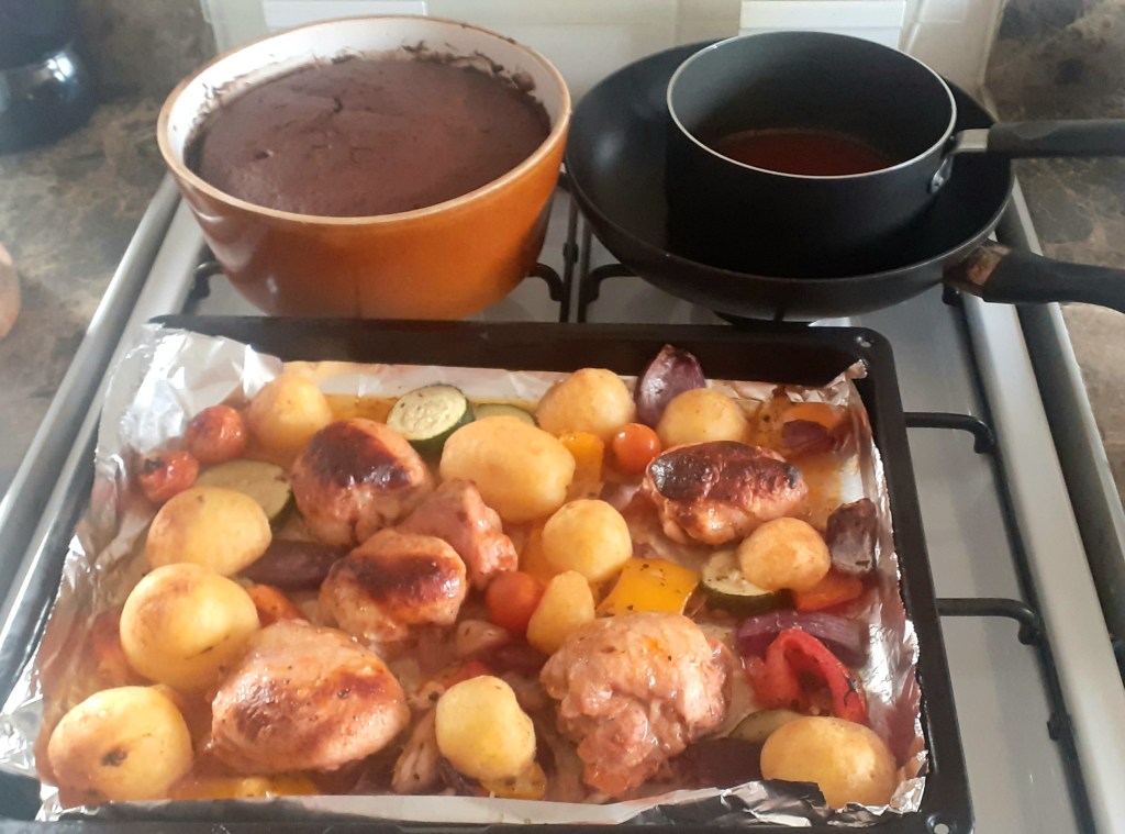 Rather than the leftovers of someone else’s Sunday roast (not that I’m turning my nose up at it: it will save me cooking tomorrow!), I marinated some chicken thighs in vaguely BBQ-y sauce of oil, smoked paprika, honey, vinegar, and seasoning (how much of each? I don’t know – some?) and roasted them with Mediterranean veg and some frozen roast potatoes. Mum made no comment on it, but ate it all except for half of one piece of chicken, which would have been chilled with the rest for lunch tomorrow, except my fingers refused to cooperate and it leapt onto the floor. 🤦♂️