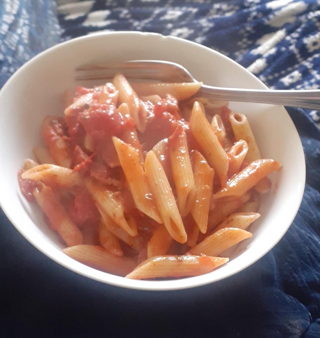 Once she had gone home, and mum had taken her first antibiotic tablet, I served our dinner of pasta ‘amatriciana’: a fancy name for pasta with bacon bits and a jar of tomato and chilli sauce. Mum ate a large portion, aware that she hadn’t eaten much for the rest of day (what she can and can’t remember on any given day is a mystery to me), then followed it with a slice of lemon meringue pie and several squares of chocolate.