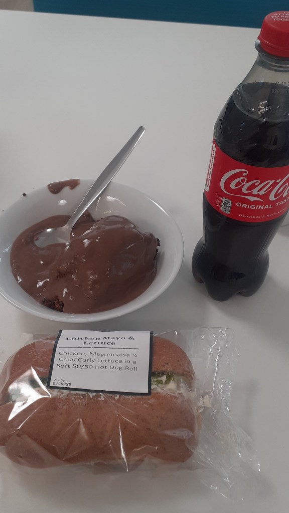 Consultation over and blood drawn, I walked a distance that felt the equivalent of the London Marathon to get some lunch. Those who remember my posts on Rate My Hospital Plate may recall my fondness for Graces Bakery chicken mayo rolls, and will be unsurprised that that’s what I grabbed from the fridge. Then I got a portion of chocolate sponge pudding with chocolate sauce, which the person serving very kindly carried to a table for me when I realised that crutches aren’t compatible with carrying a china bowl of steaming hot chocolatey goodness!