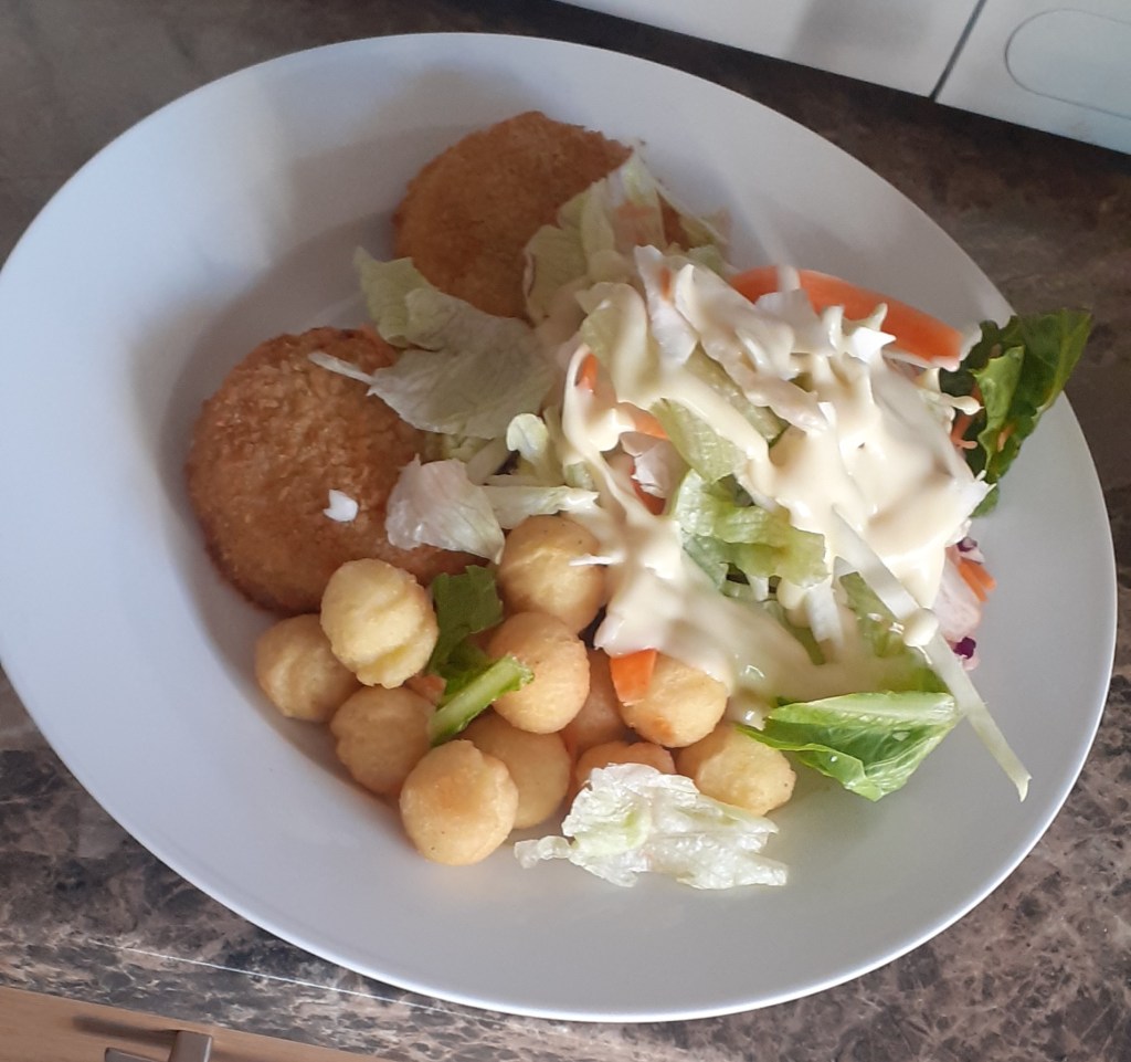 Cheese and onion crispbakes, potato pops, salad; Oreo brownie and Oreo ice cream