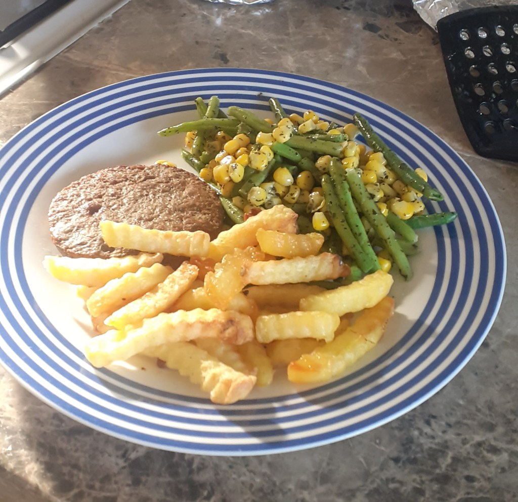 Dinner was again a freezer to oven to plate exercise, with just a bit of minted butter (a spoonful of mint sauce and a knob of butter) to jazz up the veg. It was followed by carrot cake and the last of the vanilla ice cream, which had an odd texture as mum put it away in the fridge one night and I then re-froze it: it reminded me of Mini Milk ice lollies, which I used to love, so I thoroughly enjoyed it.