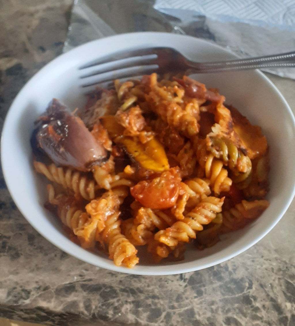 Dinner was that perennial favourite, Mediterranean vegetable pasta. It vanished quickly, so there couldn’t have been too much wrong with it.
