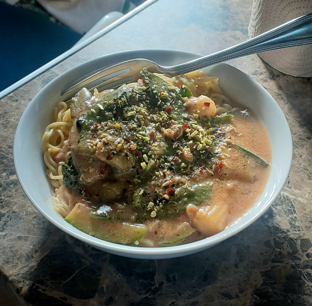 Dinner was another Simply Cook recipe: bang bang chicken, but made with vegetables as we don’t have any chicken. Mum quite enjoyed it until the noodles caused a flare of anxiety that could only be soothed by the generous application of coffee ice cream. (She was well aware that noodles shouldn’t cause anxiety, which is a step forward, I suppose.)