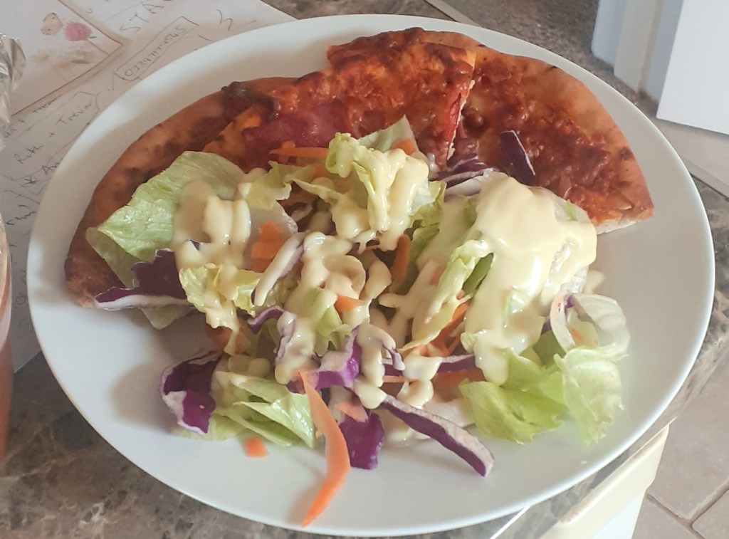 Dinner was therefore ready-made pizza – pesto veg for mum, meat feast for me (I can’t recommend the meat feast one, which tasted of not very much) – and salad, which is something we both agree on.
