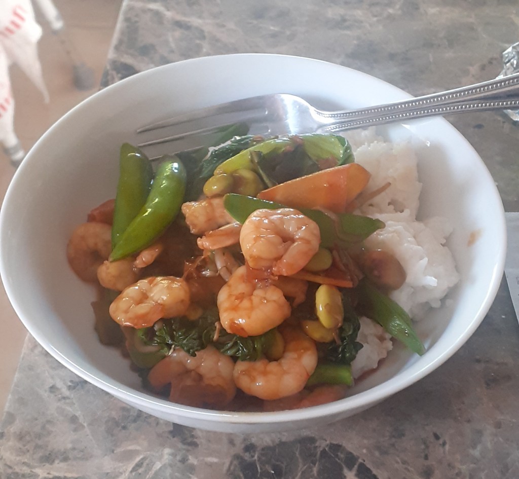 When the time came that mum asked what was for dinner, I realised that I had gone off (meal) plan and had no idea what I was going to cook. Some digging through freezer, fridge, and cupboard produced the ingredients for a prawn and vegetable stirfry, flavoured with teriyaki sauce and served with my favourite sticky coconut rice (standard basmati cooked with a chunk of creamed added to the water, leaving the rice sticky enough to be shaped with your bare hands, should you so wish).