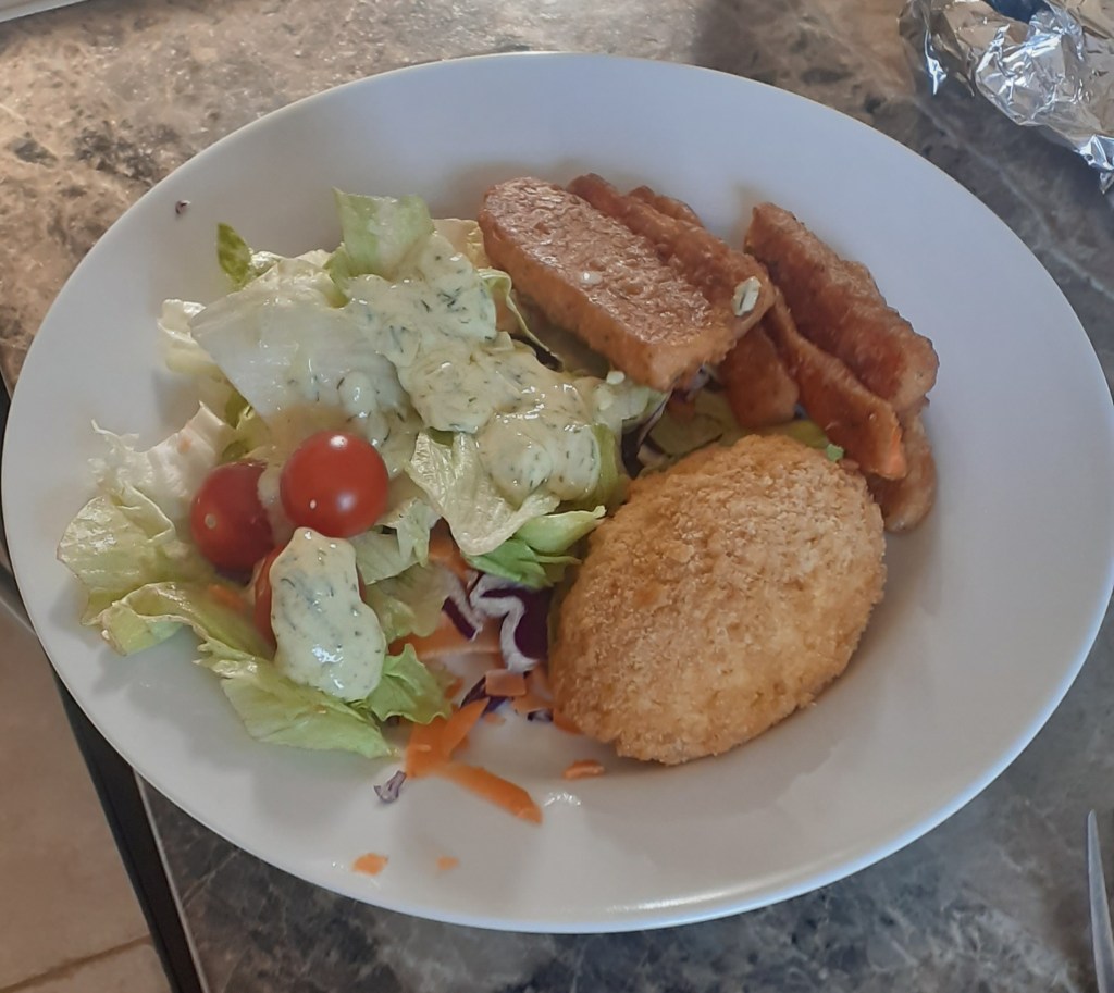 Dinner was a bit of a “what have we got in the house?” job: some cheese and ham kievs from the freezer, tempura carrots from Tesco (very tasty, as battered, fried things usually are), and salad. Mum ate most of hers, to my relief as she had barely eaten anything all day.