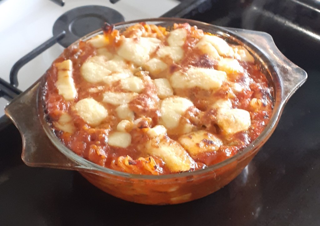 Dinner was a lazy pasta bake: tricolour pasta, a jar of tomato and garlic sauce, some roughly chopped cheddar, and some grana padano, all stirred together, dumped into a baking dish, and topped with more cheese before being baked. Mum said it was “really good”, making it the first two Mum-chelin star meal in some time.