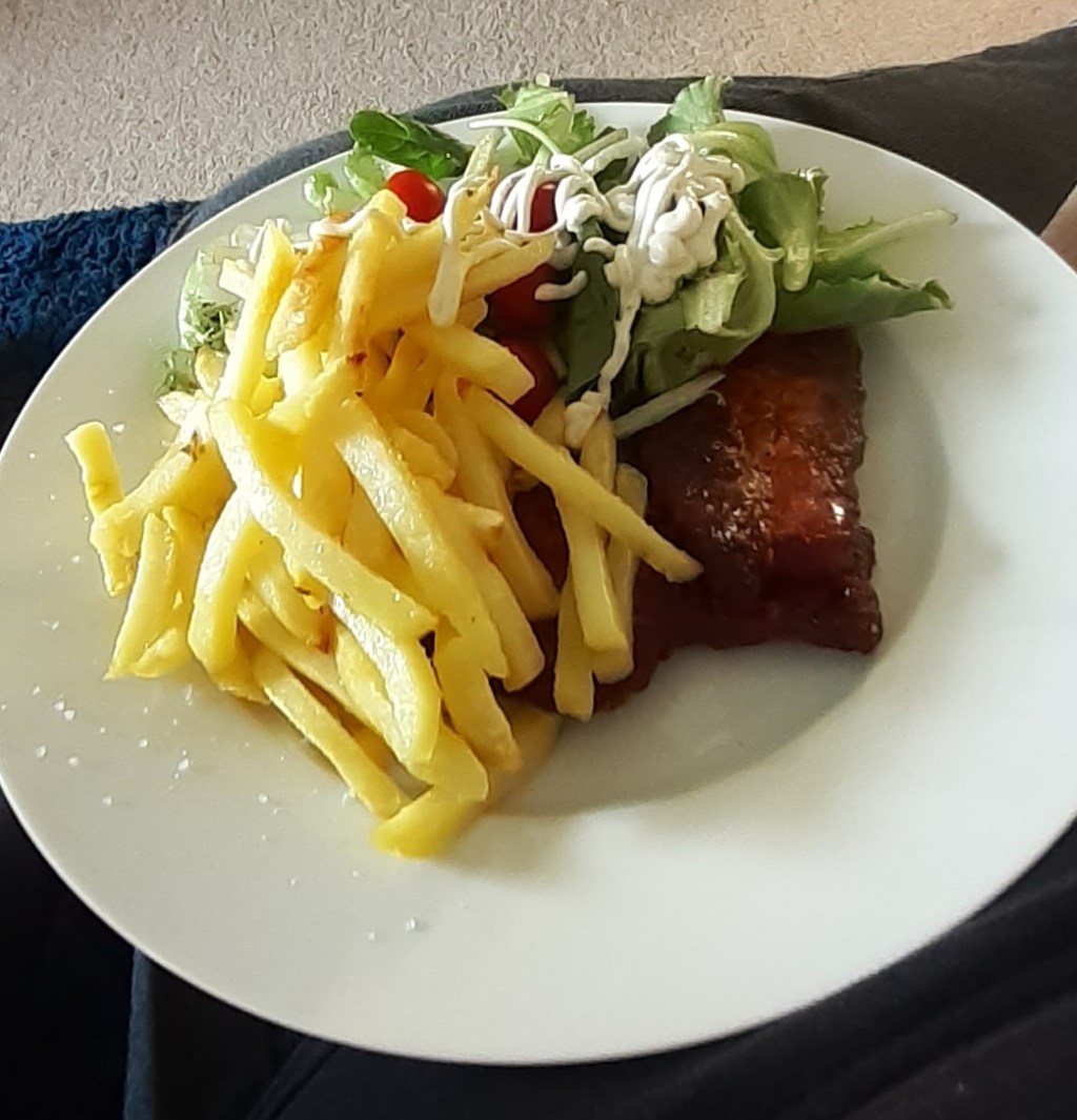 [Dinner was sweet chilli chicken for mum, BBQ pork belly for me, both accompanied by chips and salad. Mum had coffee ice cream for dessert; I had a slice of cheesecake which was nice but – sorry Tesco – nowhere near as good as the ones you can get from Iceland for less than half the price.]