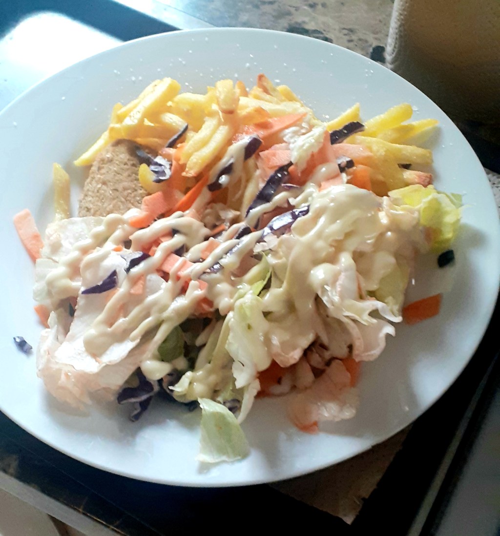Dinner was very unimaginative: garlic and herb Quorn fillets (mum said ” I won’t eat that.” I said “it tastes like chicken.” (Which it kinda does, albeit of the highly processed kind.) Mum said “oh, that’s OK then” and ate it quite happily), oven chips (which welded themselves to the kitchen foil I cooked them on), and some browning salad. How thrilling. 😕