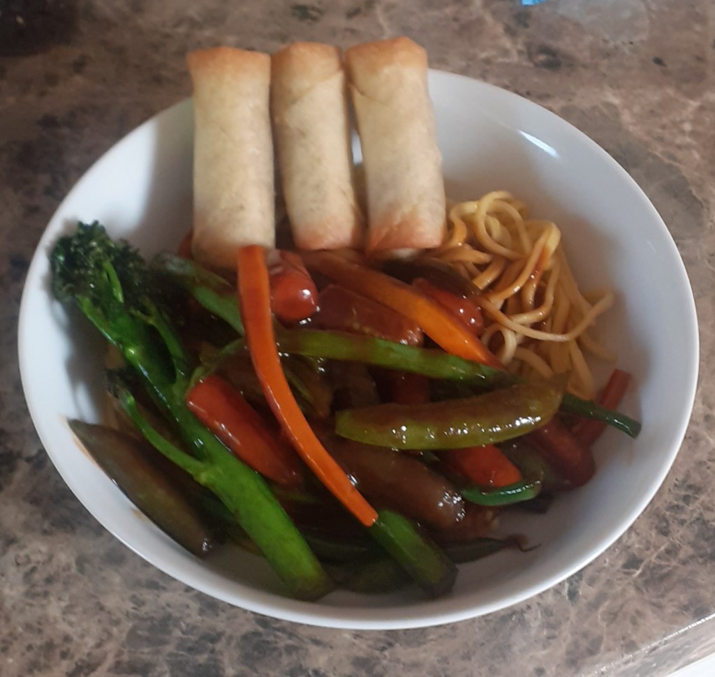 Stirfried veg in hoisin sauce, noodles, mini duck spring rolls