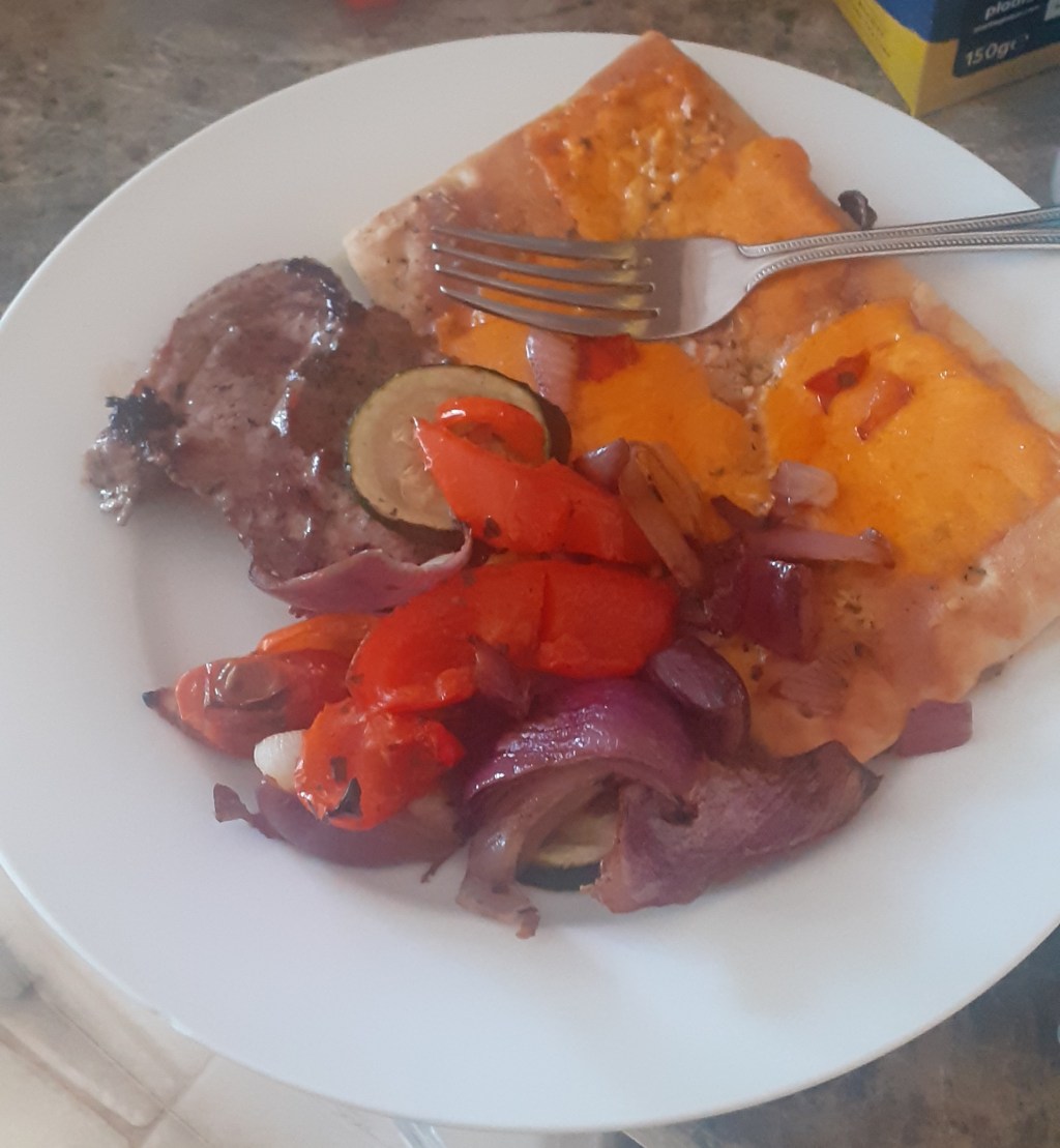 Dinner was meant to be veggie curry, but mum has had little appetite all day and I thought she wouldn’t eat enough of that, so I swapped with tomorrow’s planned meal and roasted some Mediterranean veg and pan-fried minted lamb chops. (From Tesco’s bbq range, and really not bad at all.) Mum ate half a lamb chop, some veg, and then declared she didn’t want any more.