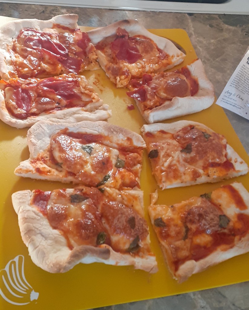 Dinner was homemade pizza, albeit made with ready-made dough and sauce: once I would have made it completely from scratch, but such a thing is sadly beyond me now.