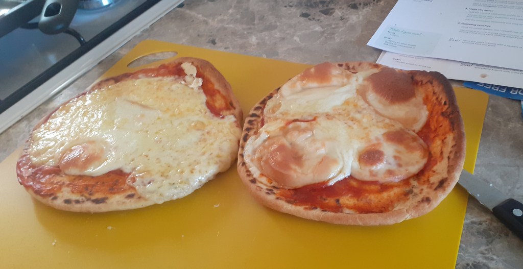 For dinner I made flatbread pizzas – supermarket flatbreads topped with pizza sauce from a jar and whatever cheese is in the fridge, baked until golden and bubbly – which we ate with the last of the salad. Not exactly inspired, but they took two minutes to make and ten to cook, which is what I want on a hot summer Sunday.