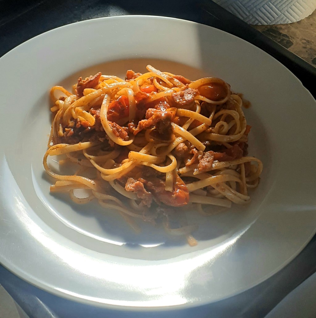 Dinner was a variation on the Italian classic amatriciana sauce: chopped smoked bacon, cherry tomatoes, tomato puree, garlic, herbs, and a little bit of chilli powder. Add some cooked pasta, mix together, eat.