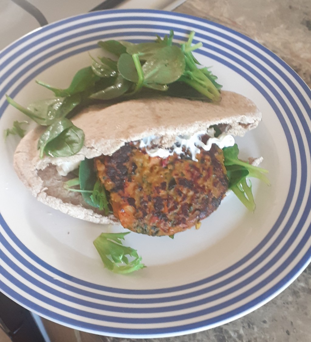 Sri Lankan-style plant burger with salad in a pitta; berry crumble and custard