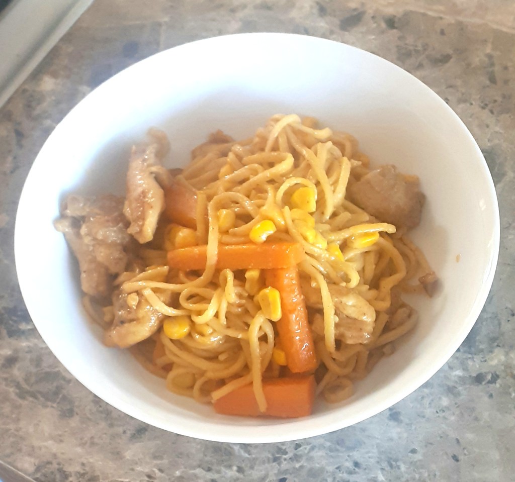 Dinner was an adaptation of a Simply Cook recipe, substituing pan-fried chicken for the oven-roasted variety (because no way was I turning on the oven in this weather) and sweetcorn for the pak choi (because we don’t have any), and reducing the chilli paste down to a bare half-tsp, as it was hot enough to make even me cough!
