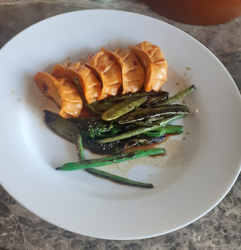 We finally ended up with stirfried veg, which I burnt, with Itsu brand king prawn gyoza which were OK but a bit softer than they should have been as I, somewhat ironically, undercooked them.