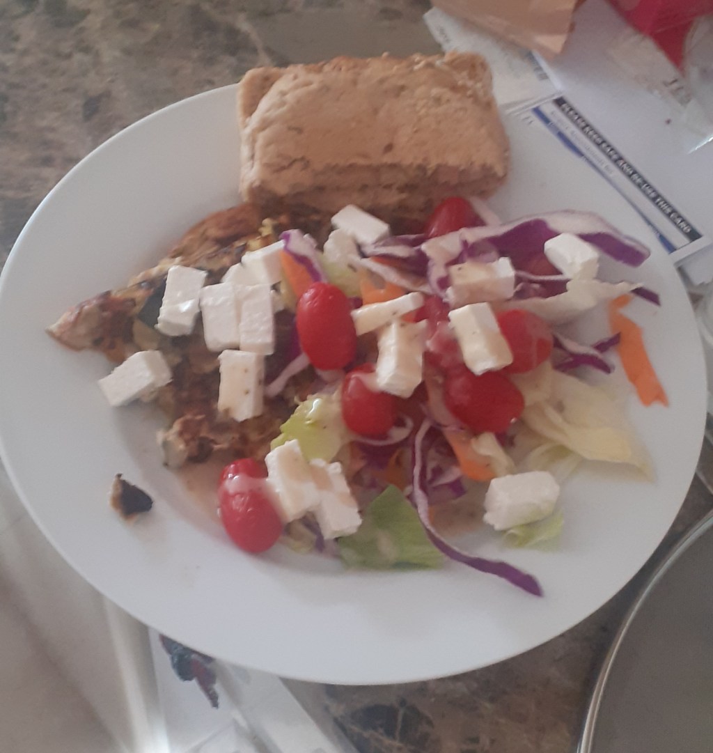 For dinner I made a frittata, which, much to my satisfaction, I successfully flipped using the pan, plate, pray method (upturned plate over the pan, hold the plate and the pan handle (oven gloves help), mutter a prayer and flip the whole lot over so the frittata is now sitting on the plate, cooked side up, then slide the frittata back into the pan to cook the other side). Mum said it was “pretty good” and ate all of hers, which was equally satisfying.