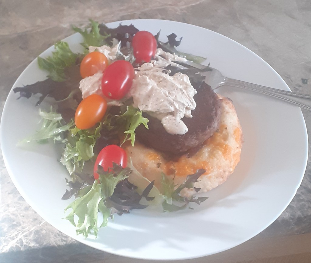 Dinner was a cheddar burger from Tesco, on a cheese flatbread, topped with chilli feta dip and served with salad and proper Isle of Wight tomatoes. You just can’t beat them.