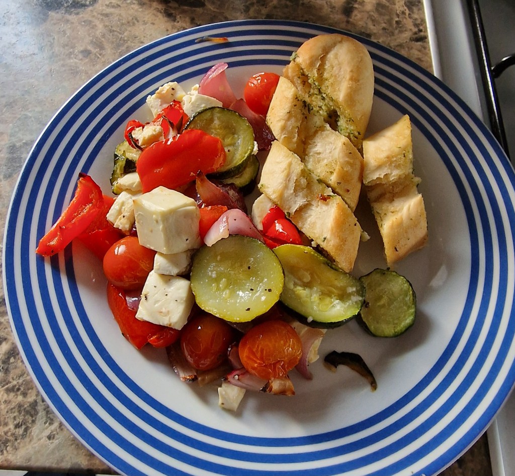Mediterranean vegetables and feta with garlic bread