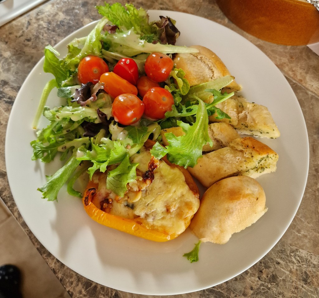 Stuffed peppers with garlic bread and salad