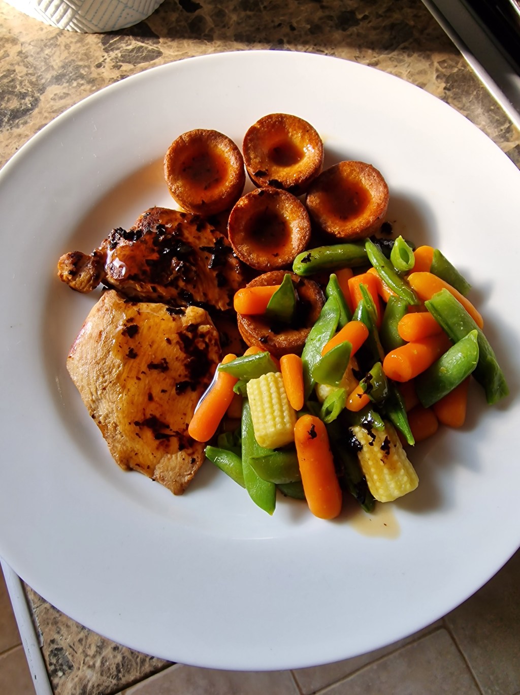 Dinner was a repeat of the cheat’s roast dinner that went down so well last week. It was received even more enthusiastically this week: mum spotted the chicken pieces and said “ooh, I like those”, said the same about the mini Yorkshire puddings, and cleared her plate except for a small piece of chicken that she’s kept for tomorrow. (Or, as more usually happens, for mum to refuse to eat two days in a row, and for me to then eat before it goes off.)