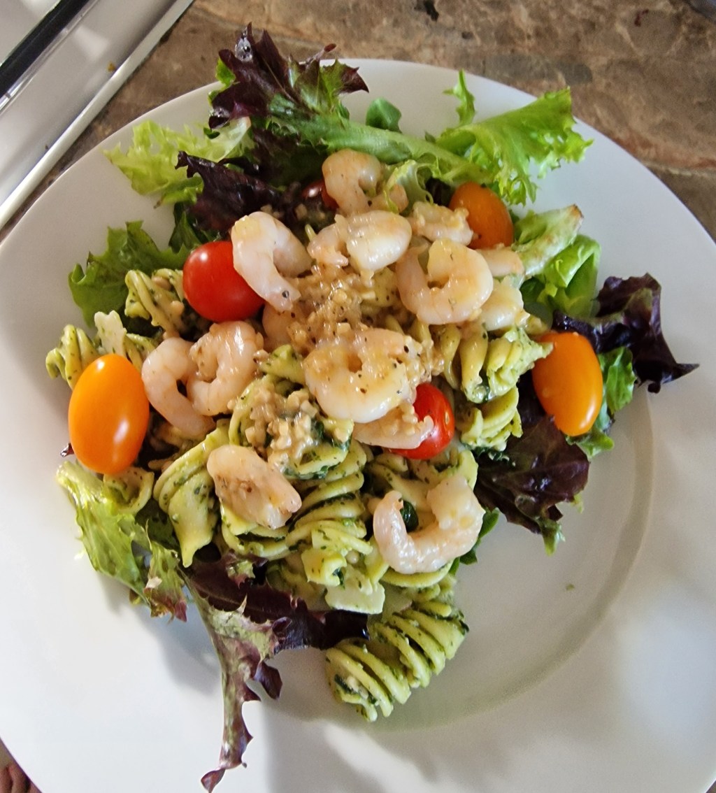 “Shrimp scampi” and pesto pasta salad