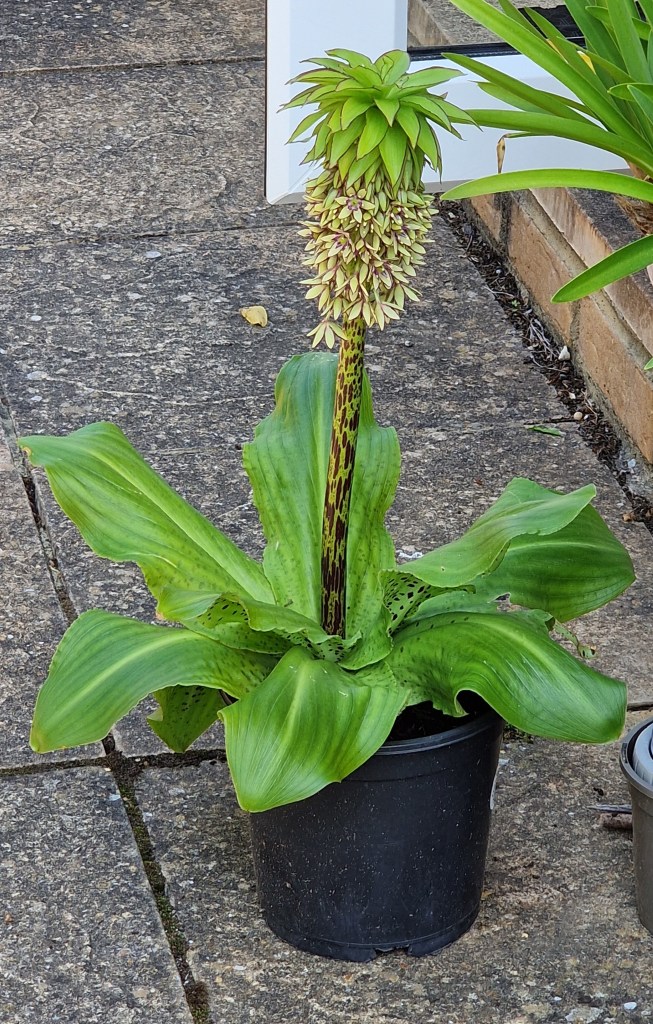 Changing the subject almost completely, this morning mum didn’t want to go out in the garden alone, and asked me to go with her. I sat on one of the garden chairs and took the photo above. Earlier this year I discovered a pot with a cluster of leaves growing in it, and gave it some water out of curiosity to see what it would grow into. The answer turns out to be this weirdly attractive plant, which Google Lens informs me is a Pineapple Lily, and I think I’m going to keep it.